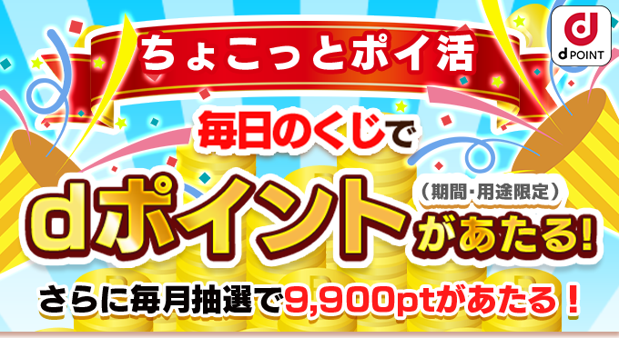 株式会社NTTドコモ及び日本エンタープライズ株式会社(以下、合わせて「キャンペーン主催者」といいます。)が実施する「ちょこっとゲームfordバリューパス」におけるキャンペーン「dポイントプレゼントキャンペーン」(以下、「本キャンペーン」といいます。)は、この規約(以下、「本規約」といいます。)に従って実施されます。必ず以下の内容をご確認いただき、同意のうえ、キャンペーンにご参加ください。■キャンペーン概要 - 1【ちょこっとくじで毎日手軽にポイ活!】キャンペーン期間中に「ちょこっとゲームfordバリューパス」で表示される、下記お題を全て達成されたお客さまに、毎日抽選でdポイント(期間・用途限定)を進呈いたします。※毎日1回下記お題を全て達成することで、1回抽選に参加できます。抽選の結果進呈されるdポイント(期間・用途限定)は、0ポイント(はずれ)、1ポイント、2ポイント、3ポイントの3種類です。※進呈されるdポイント(期間・用途限定)は、お一人さま3ポイント/日が上限となります。※進呈されるdポイント(期間・用途限定)は、お一人さま93ポイント/月を上限とさせていただきます。※対象月によって付与される最大ポイント数は異なります。※お一人さま分の進呈されるdポイント(期間・用途限定)が、月の上限ポイント数に達した場合には、その月のキャンペーンには参加できません。翌月以降は改めて参加いただけます。※キャンペーン終了時までにお題を達成された方が対象です。■キャンペーン期間2024年6月1日(土)0:00~2024年11月30日(土)23:59■キャンペーン対象者「dバリューパスパック」もしくは「dバリューパス」契約者かつ、「dポイントクラブ」会員のお客さまで、キャンペーン期間中に「ちょこっとゲームfordバリューパス」で表示される、下記お題を全て達成されたお客さま。<お題内容>【お題】「ちょこっとくじ」を引く※お題及び進呈ポイント数は「ちょこっとゲームfordバリューパス」サイト上で告知のうえ変更する場合がございます。あらかじめご了承ください。※お題の達成状況は毎日更新され、それぞれ1日1回達成することができます。■ポイント進呈予定日及び進呈ポイント数1日1回「ちょこっとくじ」を引くことができます。くじの結果で中吉が出ると1ポイント、大吉が出ると2ポイント、大大吉が出来る3ポイント当選となります。当選した方には、当月獲得したdポイント(期間・用途限定)を翌月末を目処に進呈させていただきます。応募期間①;2024年6月1日(土)0:00~2024年6月30日(日)23:59進呈日①;2024年7月末進呈ポイント数;ちょこっとくじ1回につき抽選で0ポイント~3ポイント付与応募期間②;2024年7月1日(月)0:00~2024年7月31日(水)23:59進呈日②;2024年8月末進呈ポイント数;ちょこっとくじ1回につき抽選で0ポイント~3ポイント付与応募期間③;2024年8月1日(木)0:00~2024年8月31日(土)23:59進呈日③;2024年9月末進呈ポイント数;ちょこっとくじ1回につき抽選で0ポイント~3ポイント付与応募期間④;2024年9月1日(日)0:00~2024年9月30日(月)23:59進呈日④;2024年10月末進呈ポイント数;ちょこっとくじ1回につき抽選で0ポイント~3ポイント付与応募期間⑤;2024年10月1日(火)0:00~2024年10月31日(木)23:59進呈日⑤;2024年11月末進呈ポイント数;ちょこっとくじ1回につき抽選で0ポイント~3ポイント付与応募期間⑥;2024年11月1日(金)0:00~2024年11月30日(土)23:59進呈日⑥;2024年12月末進呈ポイント数;ちょこっとくじ1回につき抽選で0ポイント~3ポイント付与--------------------------------------■キャンペーン概要 -2【脳トレゲームを遊んでdポイントがあたる!】キャンペーン期間中に「ちょこっとゲームfordバリューパス」で表示される、下記お題を全て達成されたお客さまに、毎月抽選でdポイント(期間・用途限定)を進呈いたします。※進呈されるdポイント(期間・用途限定)は、お一人さま9,900ポイント/月を上限とさせていただきます。※お一人さま分の進呈されるdポイント(期間・用途限定)が、月の上限ポイント数に達した場合には、その月のキャンペーンには参加できません。翌月以降は改めて参加いただけます。※キャンペーン終了時までにお題を達成された方が対象です。■キャンペーン期間2024年6月1日(土)0:00~2024年11月30日(土)23:59■キャンペーン対象者「dバリューパスパック」もしくは「dバリューパス」契約者かつ、「dポイントクラブ」会員のお客さまで、キャンペーン期間中に「ちょこっとゲームfordバリューパス」で表示される、下記お題を全て達成されたお客さま。<お題内容>【お題】下記いずれかの方法で抽選券を1枚以上獲得する①今日のミッション対象ゲームをプレイ、②今日のミッション対象ゲームをクリア、③マイページ・ショートカットアプリ・dポイントがあたる!ページからのログイン※抽選券の配布期間は、毎月1日から末日までとなります。※当月の抽選券を1枚以上所持している時点で、当月の抽選への応募が自動的に完了いたします。※集めた抽選券は月末時点の所持枚数を応募口数として翌月に抽選を行い